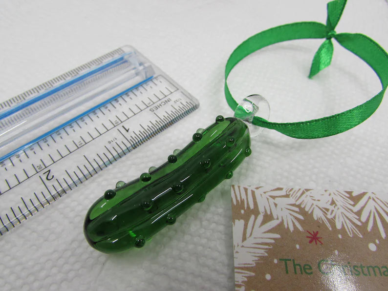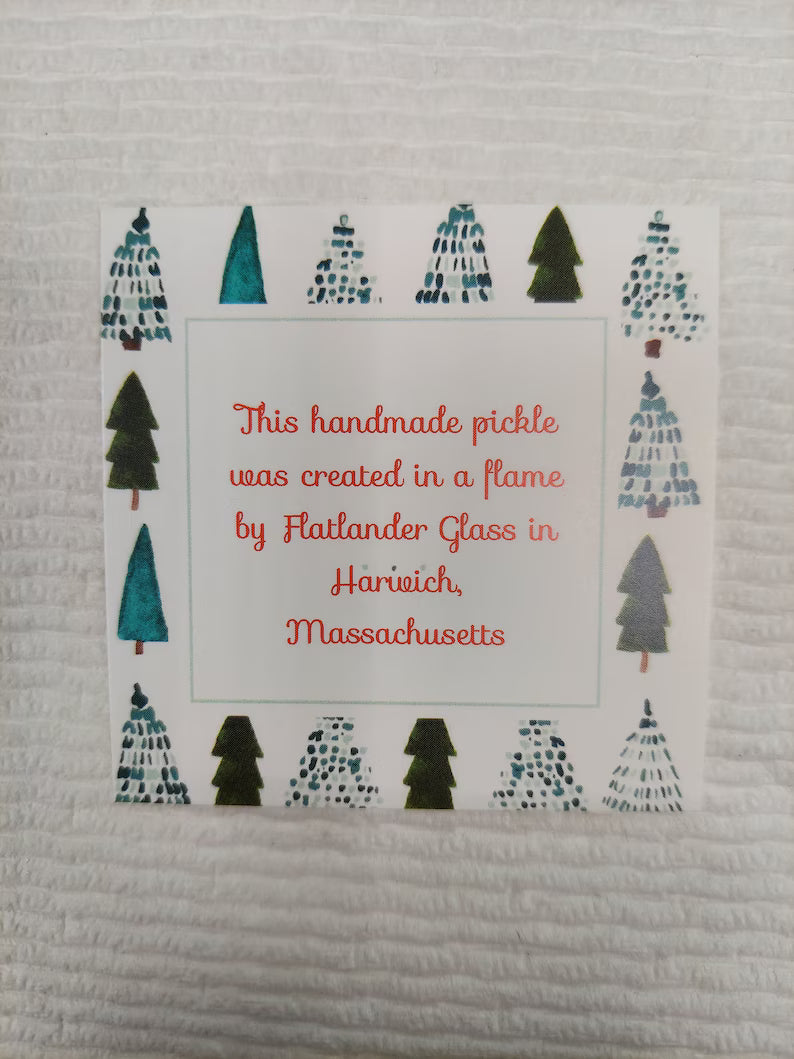 In a Pickle for a Gift??? This handmade Christmas pickle tree ornament is made of borosilicate glass. It was flameworked on a torch by Flatlander, a member of my team in Massachusetts, who is an expert in flame working.