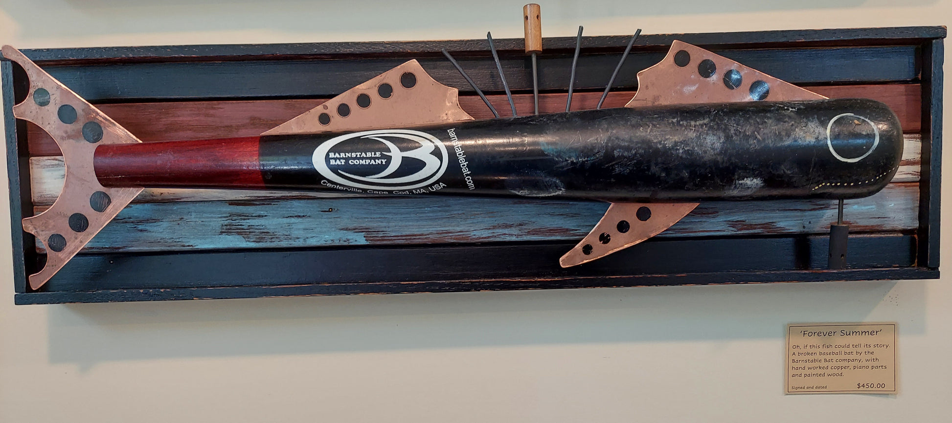 A broken baseball bat by the beloved Barnstable Bat Company, with hand worked copper, piano parts and painted wood.