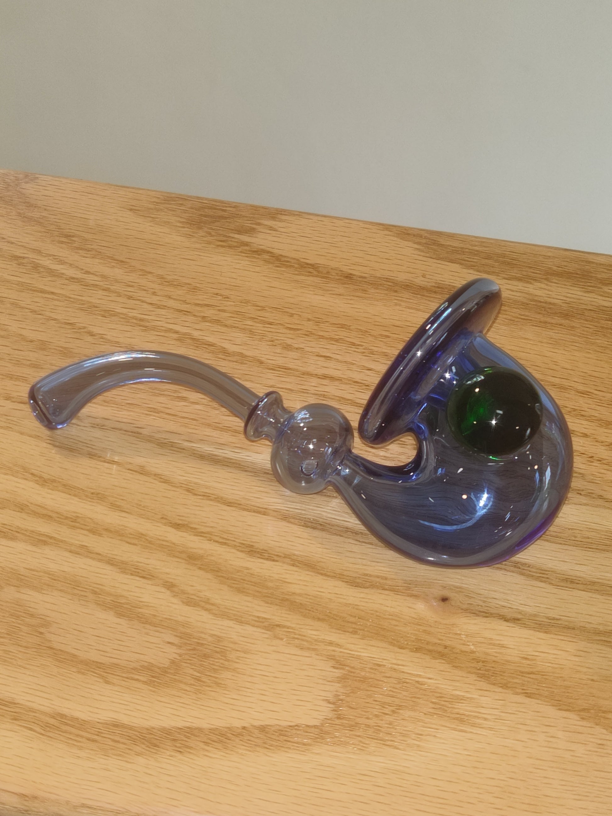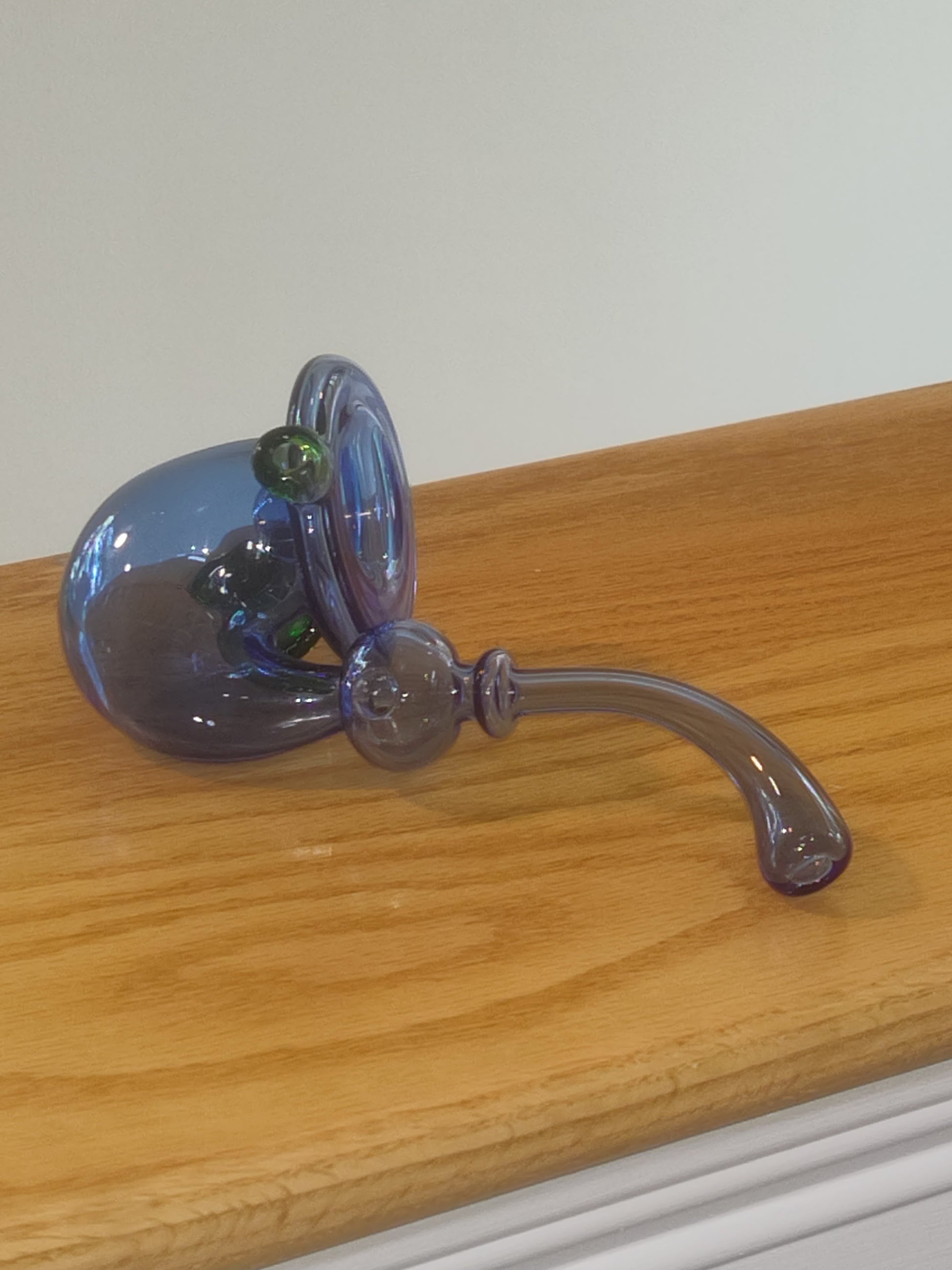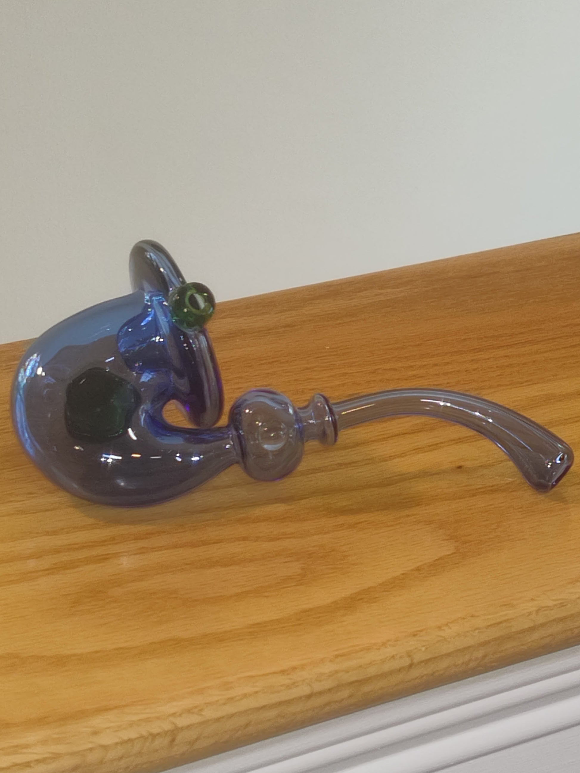 Handmade handblown sherlock smoking pipe by Massachusetts artist David Colton. Light blue color, Unique contemporary style. Green kickstand accent. Signed 2025 by the artist.
